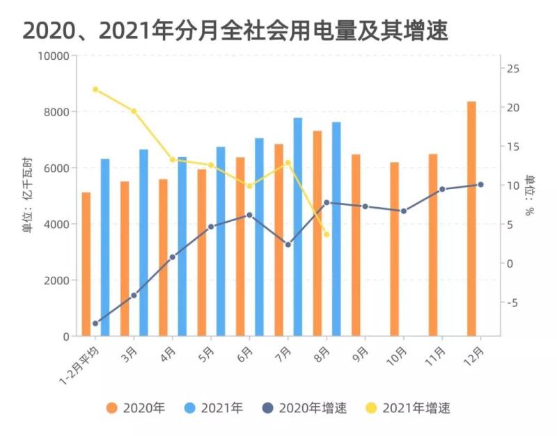 國家能源局數(shù)據(jù)顯示,2021年以來,全社會用電量增速總體呈下降態(tài)勢。2021年1-8月,用電量分月增速分別為22.2%(1-2月平均)、19.4%、13.2%、12.5%、9.8%、12.8%、3.6%。