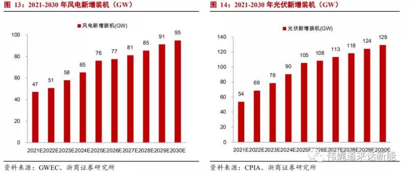 我們認(rèn)為在雙碳政策支持、產(chǎn)業(yè)經(jīng)濟(jì)性突出的背景下,2030年全國非化石能源消費(fèi)占一次能源比例有望達(dá)到28%,測算“十四五”期間風(fēng)電和光伏以及儲(chǔ)能將分別實(shí)現(xiàn)年均新增裝機(jī)59GW、79GW以及22.6GWh。