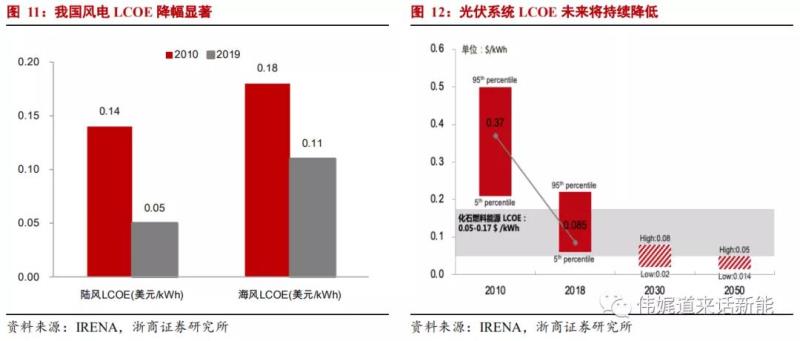 風(fēng)電方面,根據(jù)IRENA 統(tǒng)計(jì),截止 2019 年,我國陸/海風(fēng)的 LCOE 已經(jīng)由 2010 年的 0.14/0.18 美元/kWh下降到了 0.05/0.11 美元/kWh,降幅分別為 66%和 37%。另外根據(jù)今年 6 月發(fā)改委發(fā)布的《關(guān)于 2021 年新能源上網(wǎng)電價(jià)政策有關(guān)事項(xiàng)的通知》,我國新核準(zhǔn)的陸風(fēng)項(xiàng)目平價(jià)上網(wǎng),海風(fēng)項(xiàng)目也有望在十四五期間實(shí)現(xiàn)平價(jià)。光伏方面,當(dāng)前國內(nèi)光伏項(xiàng)目 LCOE 已降至0.25-0.35 元/kWh,基本實(shí)現(xiàn)平價(jià);全球光伏 2018 年 LCOE 均值為 0.085 美元/kWh,且據(jù)IRENA 預(yù)測,未來全球光伏 LCOE 仍有 30-50%降本空間。