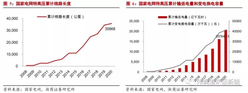 特高壓項(xiàng)目確實(shí)有效促進(jìn)了新能源外送。2020 年特高壓工程在運(yùn)在建線路長度達(dá)到3.59 萬千米,變電(換流)容量達(dá)到 4.1 億千瓦,特高壓電網(wǎng)累計(jì)輸送電量超過了 2.1 萬億千瓦時(shí),2020 年當(dāng)年輸送電量 4567 億度,占當(dāng)年國網(wǎng)供電量的 10%。