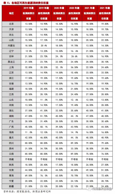 消納責(zé)任權(quán)重成為平價(jià)后國家規(guī)劃風(fēng)光等驅(qū)動(dòng)可再生能源裝機(jī)的核心手段。目前我國光伏和陸上風(fēng)電已經(jīng)實(shí)現(xiàn)平價(jià),海上風(fēng)電平價(jià)也有望在十四五期間實(shí)現(xiàn)平價(jià)。通過下發(fā)各地可再生能源消納責(zé)任權(quán)重目標(biāo),各地區(qū)新增風(fēng)光機(jī)組不再由國家能源局統(tǒng)一規(guī)劃,而是通過消納權(quán)重的執(zhí)行來實(shí)現(xiàn)。各地能夠通過國家給出的發(fā)電量和消納權(quán)重測算出2021 年各類可再生能源應(yīng)該達(dá)到的發(fā)電量,從而進(jìn)行裝機(jī)規(guī)劃。此外,文件中公布的最低權(quán)重只是可再生能源的裝機(jī)下限,考慮到文件中還具備激勵(lì)性權(quán)重,有余力的地方有望超額完成目標(biāo),從而提高風(fēng)光裝機(jī)增量。