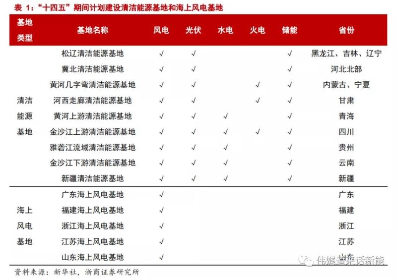 根據(jù)新華社公布的《中華人民共和國國民經(jīng)濟(jì)和社會(huì)發(fā)展第十四個(gè)五年規(guī)劃和2035年遠(yuǎn)景目標(biāo)綱要》,為大幅提升風(fēng)電、光伏的發(fā)電規(guī)模,構(gòu)建各類電源協(xié)調(diào)互補(bǔ)的現(xiàn)代化清潔能源體系,未來我國將持續(xù)開發(fā)包括水電、風(fēng)電、光伏等電源在內(nèi)的多個(gè)清潔能源基地,進(jìn)而形成9大集風(fēng)光(水火)儲(chǔ)于一體的大型清潔能源基地以及5大海上風(fēng)電基地。