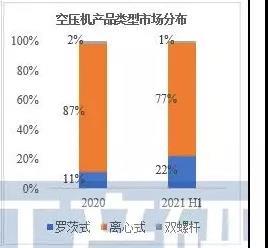 從技術(shù)路線來看,氫燃料電池用空壓機類型主要有容積型空壓機和速度型空壓機,國內(nèi)常用的氫燃料電池空壓機主要有容積型羅茨式空壓機和雙螺桿式空壓機、速度型離心式空壓機三種。2020年與2021H1空壓機產(chǎn)品類型市場分布如下: