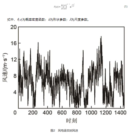 為了分析每小時風力輸出,本研究采集了2019年夏縣2個月間的風電場實時風速,如圖2所示。顯然,風力輸出是不確定的,為了建立確定性風力輸出模型,區(qū)別于使用具有加權(quán)因子的5個代表日,或采用高斯法擬合風力發(fā)電數(shù)據(jù)構(gòu)建隨機模型。本文使用廣泛應用于處理不確定性風力問題的威布爾(Weibull)概率分布函數(shù)[10]進行建模,其數(shù)學表達式見式(1)