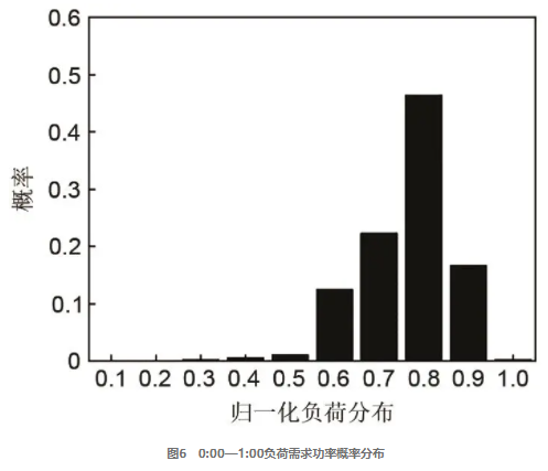 顯然,實時負荷需求是不確定的。為了應對不確定的負荷需求,相較于文獻使用了模糊聚類理論獲得典型的每小時負荷需求。本研究主要通過[17]加權(quán)平均法(WAM)獲得典型的每小時負荷需求。圖6描繪了0:00—1:00期間負荷需求的概率分布。