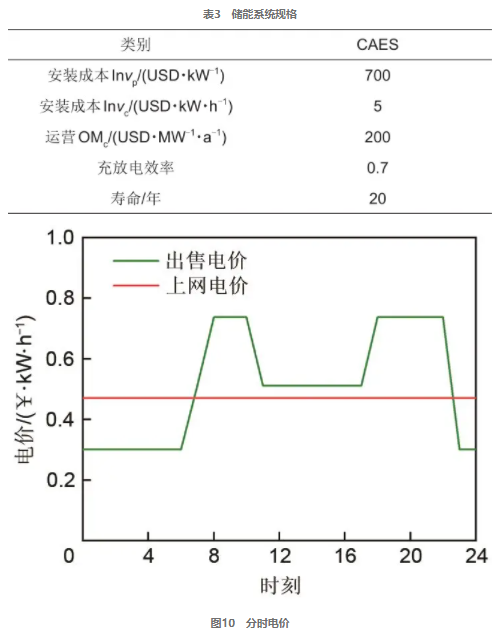 為了驗證該模型的準確性和可靠性,可以利用表3所示參數(shù)進行CAES容量配置。其參數(shù)如下,投資利率8%,有效壽命內(nèi)年均工作200天,儲氣罐初始儲量50%,容量范圍限制在10%~90%,CAES系統(tǒng)的圖片和圖片設定為離散值,在[0,12 MW·h]和[0,12 MW]的范圍內(nèi)以步進0.5 MW·h和0.5 MW進行尋優(yōu),以配置CAES系統(tǒng)最佳存儲規(guī)模。電網(wǎng)電價執(zhí)行山西省分時雙重計價如圖10所示。