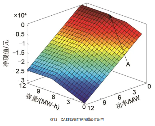 CAES系統(tǒng)存儲規(guī)模配置過程見圖13。該過程嚴格執(zhí)行2.3節(jié)的求解算法,在系統(tǒng)額定功率和額定容量限定范圍內(nèi)逐步尋優(yōu)。如圖可見,隨著CAES容量的增加,系統(tǒng)總收益先增加后減小,仿真結(jié)果顯示在A點達到峰值,該點處圖片=1 MW、圖片=6.5 MW·h,其日最大凈利潤為699.86元。出現(xiàn)上述變化的原因是:CAES存儲規(guī)模的擴大進而造成系統(tǒng)投資和運行成本大幅度增長,影響了系統(tǒng)經(jīng)濟效益。