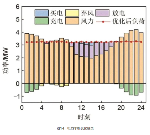 綜上所述,該模型可有效實現(xiàn)風電耦合系統(tǒng)儲能存儲規(guī)模的配置。電力平衡優(yōu)化結(jié)果如圖14所示,其是基于場景2的設定實現(xiàn)的。調(diào)度結(jié)果如下:0:00—4:00、20:00—24:00時間段內(nèi),在滿足用戶負荷需求后出現(xiàn)了多余風力,故通過CAES系統(tǒng)進行存儲以減少能量的浪費;6:00后,CAES系統(tǒng)儲氣罐已達滿負荷狀態(tài),其需要在優(yōu)化策略下進行適宜調(diào)節(jié),故出現(xiàn)棄風量增大現(xiàn)象;10:00開始,風力減弱,此時由風力發(fā)電、壓縮空氣儲能、電網(wǎng)協(xié)同運行,為用電用戶供電。