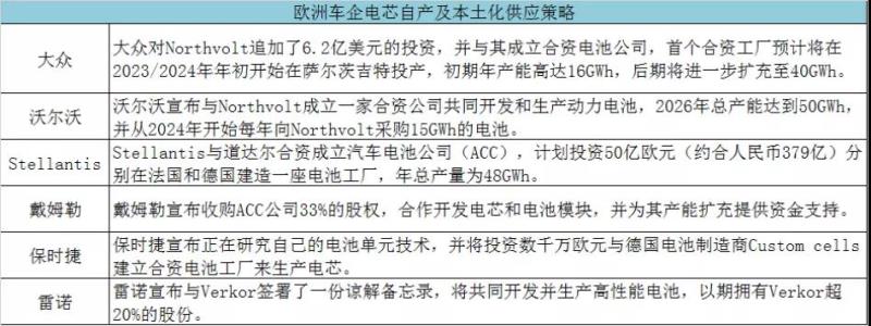 不過,從上述歐洲主機(jī)廠的布局動作來看,加快導(dǎo)入本土電池供應(yīng)商且謀劃自產(chǎn)電芯,已經(jīng)成為了眾多歐洲主機(jī)廠保障其未來電池供應(yīng)穩(wěn)定,提升市場競爭力的共同路徑。