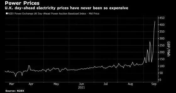 英國天然氣價格的暴漲無疑加劇了電價上漲的幅度和速度。與英國相比,德國電價也一直上漲。但明顯最近一個多月的時間里,英國的電價漲幅更高。