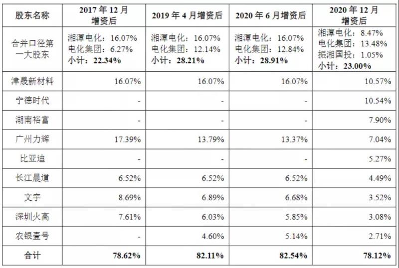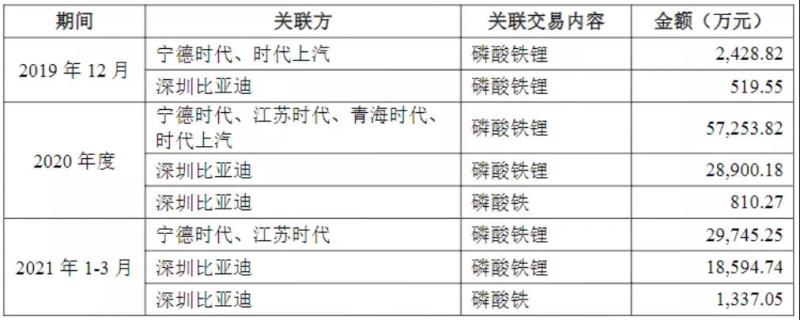 2020年12月,湖南裕能增資擴股并引入了主要客戶寧德時代、比亞迪作為戰(zhàn)略投資者入股,后者分別持有湖南裕能10.54%、5.27%股權。此外,寧德時代通過旗下寧波問鼎出資間接參股長江晨道,而長江晨道自2017年起多次參與增資湖南裕能,合計持有4.49%股權。