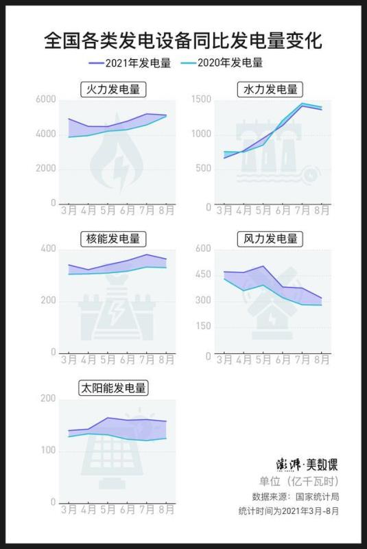 盡管我國水利、風(fēng)力發(fā)電設(shè)備等清潔能源的裝機量正在逐年增長,但發(fā)電體量與火電相比還有很大的差距。國家統(tǒng)計局?jǐn)?shù)據(jù)顯示,雖然風(fēng)力發(fā)電量同比增幅在各類發(fā)電設(shè)備中最高,但發(fā)電量僅達(dá)到火力發(fā)電的6%(2021年8月)。同時,火力發(fā)電量在今年3-8月依然保持了月均11.2%的同比增長。