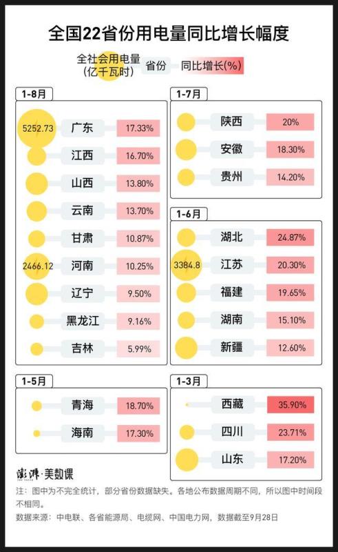 據(jù)不完全統(tǒng)計,今年以來,各地區(qū)用電量同比增幅顯著。其中,西藏、湖北、四川、江蘇和陜西的同期用電量增幅均超過20%。