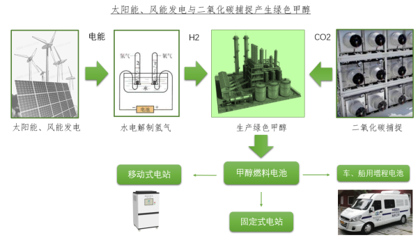 儲能方面,新能源發(fā)電與二氧化碳結(jié)合,制造“綠色甲醇”;把風能太陽能以液體甲醇的形式儲存下來,使得甲醇成為風能太陽能的儲運載體,成為風能太陽能液體儲能路線??梢缘统杀?、大規(guī)模實現(xiàn)能源的儲存和運輸。