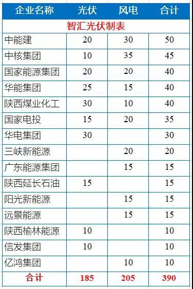 9月30日,陜西省發(fā)改委下發(fā)《關(guān)于陜武直流一期外送新能源項(xiàng)目優(yōu)選結(jié)果的公示》,確定了32個項(xiàng)目共計390萬千瓦納入陜武直流一期外送新能源項(xiàng)目(其中風(fēng)電17個共205萬千瓦,光伏15個共185萬千瓦)。其中,中能建、中核集團(tuán)分別獲得50萬千瓦、45萬千瓦,國家能源集團(tuán)、華能集團(tuán)、陜西煤業(yè)化工獲得40萬千瓦。各企業(yè)獲得規(guī)模如下表所示。