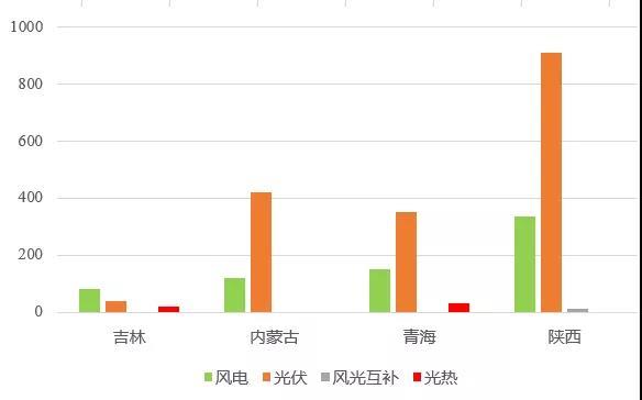 其中,陜西省規(guī)模最大,達(dá)到1253萬千瓦,吉林省規(guī)模較小,為140萬千瓦。內(nèi)蒙古、青海分別為540萬千瓦、530萬千瓦,四省各類項(xiàng)目規(guī)模分布如下圖所示。