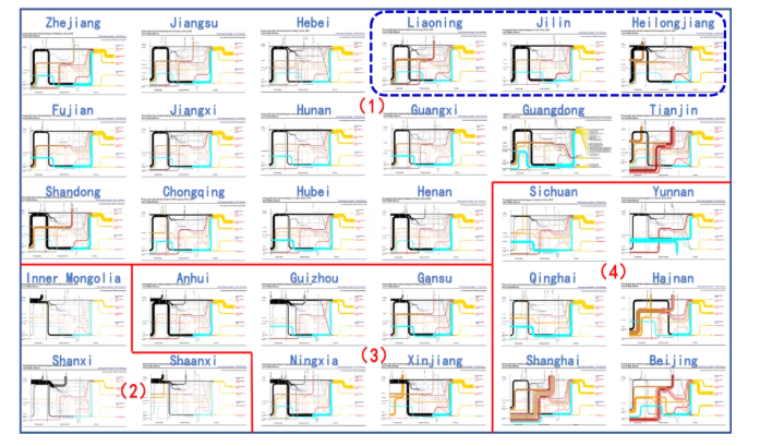 因?yàn)樾姓芾矸指畹膯栴},各個(gè)區(qū)域在能源供需上存在各自優(yōu)化現(xiàn)象,很多時(shí)候并不能做到全國一盤棋的理想性優(yōu)化調(diào)度。區(qū)域間的能源互通基礎(chǔ)設(shè)施也是不足的,需要在低碳發(fā)展要求下加強(qiáng)建設(shè)。一旦出現(xiàn)緊急事件,基本以自救和已經(jīng)建立的通道進(jìn)行跨區(qū)域協(xié)調(diào)為主,而且也跟區(qū)域的全國位勢有關(guān)。這樣,在區(qū)域協(xié)調(diào)方面東北有可能處于一個(gè)被忽視的地位,也缺乏跨區(qū)域通道。圖5是我們繪制的2016年各省份能源分配?;鶊D,可以看到東三省在右上角。其能源供需的主要特點(diǎn)是:除了石油產(chǎn)品方面和外部有較強(qiáng)的互通外,煤炭和電力基本是自給自足的,所以和外部的互通能力應(yīng)該不足。一旦出了事故,因?yàn)楦饨绲哪茉赐凡粔?,容易?dǎo)致應(yīng)急調(diào)度能力存在限制。國家的區(qū)域戰(zhàn)略也是以強(qiáng)調(diào)某片區(qū)域?yàn)橹鳎绱髤^(qū)域的大規(guī)模協(xié)調(diào)目前應(yīng)該不但缺乏基礎(chǔ)設(shè)施布局,也缺乏體制機(jī)制的保障。