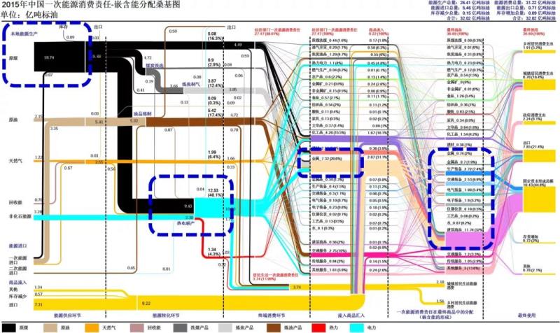 圖 4 2015年我國一次能源消費(fèi)責(zé)任—嵌含能分配桑基圖