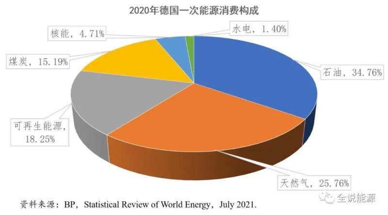 具體細(xì)分,德國的能源消費(fèi)高度依賴傳統(tǒng)的化石能源。2020年,德國一次能源消費(fèi)結(jié)構(gòu)中,石油是第一大能源來源,占比34.76%;天然氣第二,占比25.76%;可再生能源第三,占比18.25%;煤炭第四,占比15.19%;核能第五,占比4.71%;水電第六,占比1.4%。
