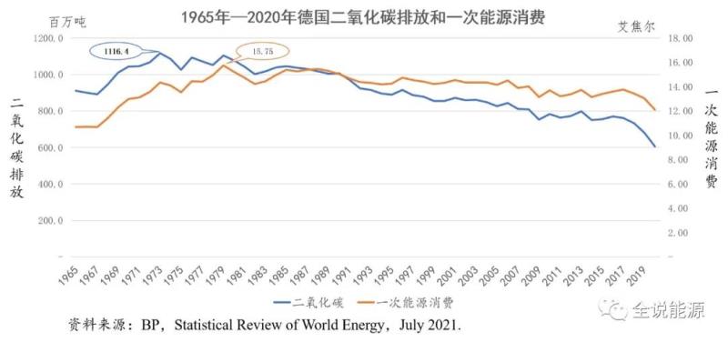 從統(tǒng)計(jì)數(shù)字看,德國能源消費(fèi)產(chǎn)生的二氧化碳排放量最高的年份,是49年前的1973年,為11.164億噸,自此之后就再也沒有超過這個(gè)數(shù)字。因此,可以說,早在約50年前德國就已經(jīng)實(shí)現(xiàn)了碳達(dá)峰,德國能源消費(fèi)的二氧化碳達(dá)峰,與后來逐漸大熱的氣候問題和減排,沒有任何直接的關(guān)系。