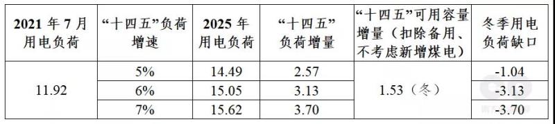 電力平衡應(yīng)該用各省的最高用電負(fù)荷為基數(shù)、預(yù)測(cè)各省的負(fù)荷需求,與各省的可用容量進(jìn)行平衡,再加總。本文受限于篇幅和工作量,無(wú)法分省測(cè)算,用2021年7月14日的全國(guó)最高用電負(fù)荷11.92億千瓦為基數(shù),用電負(fù)荷年均增速按5%-7%估算,則“十四五”用電負(fù)荷增量為2.57-3.70億千瓦,而新增的可用容量(不考慮新增煤電、扣除備用)僅1.53億千瓦(冬),冬季負(fù)荷缺口為1.04-3.70億千瓦。