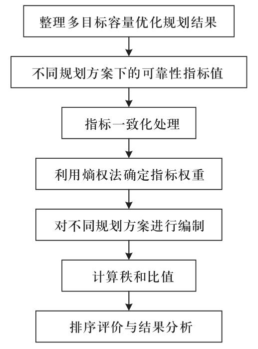 僅依照可靠性指標(biāo)的數(shù)值,只是簡單對比不同規(guī)劃方案對應(yīng)每個可靠性指標(biāo)值的大小,無法確定哪種規(guī)劃方案的可靠性指標(biāo)更優(yōu),因此,本文利用熵權(quán)法定權(quán)的秩和比評價方法進(jìn)行評價,排序選出綜合3種可靠性指標(biāo)最優(yōu)的規(guī)劃方案。從不同規(guī)劃方案的具體可靠性指標(biāo)值出發(fā)考慮,利用熵權(quán)法對3個可靠性指標(biāo)的權(quán)重進(jìn)行求取,其中,風(fēng)光互補(bǔ)特性、供電自給損失率為負(fù)向指標(biāo),風(fēng)光儲多能源混合系統(tǒng)貢獻(xiàn)率為正向指標(biāo)。求解得到風(fēng)光互補(bǔ)特性、供電自給損失率、風(fēng)光儲多能源混合系統(tǒng)貢獻(xiàn)率的權(quán)重分別為0.435 3、0.251 4、0.313 3。
