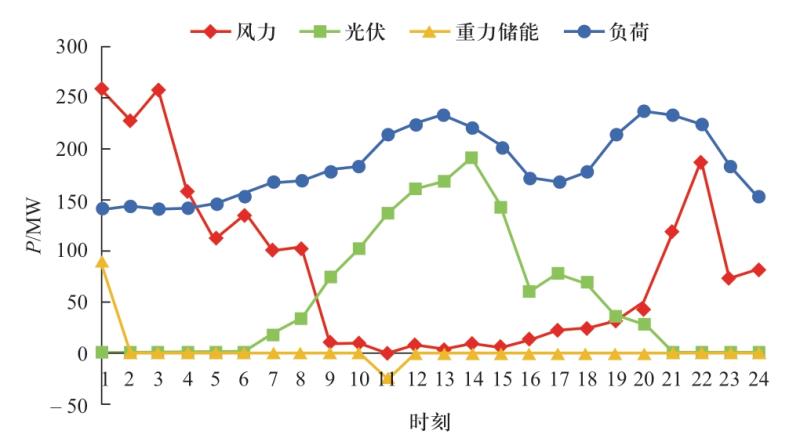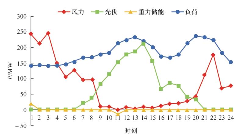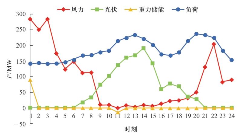 由于不同規(guī)劃方案中的風(fēng)電場、光伏電站、重力儲能的容量不同,導(dǎo)致每時刻風(fēng)力、光伏出力不同,重力儲能在配合時進(jìn)行儲能和放電的電量也不同。由圖6—圖9可以看出,不同規(guī)劃方案的出力曲線趨勢一致,這主要是因?yàn)椴煌?guī)劃方案規(guī)劃的風(fēng)電場、光伏電站的容量相差不大,但仍能看出規(guī)劃方案二中每時刻的光伏出力較大,而規(guī)劃方案三中每時刻的風(fēng)力出力較大。