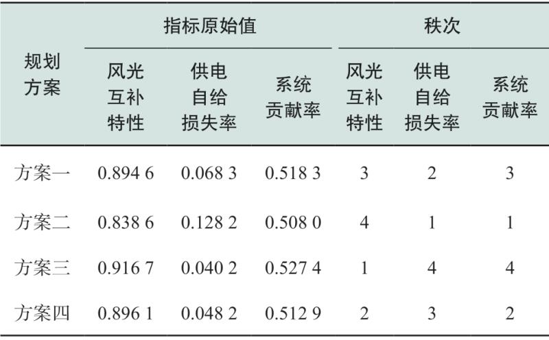 規(guī)劃方案一、規(guī)劃方案二、規(guī)劃方案三、規(guī)劃方案四的加權(quán)秩和比值分別為0.687 5、0.573 6、0.671 9、0.569 4,評分排序?yàn)?、3、2、4。因此,僅從3種可靠性指標(biāo)來看,規(guī)劃方案一最優(yōu),其次為規(guī)劃方案三、規(guī)劃方案二,最后為規(guī)劃方案四??傮w來看,規(guī)劃方案一和規(guī)劃方案三中均考慮了系統(tǒng)的可靠性,對綜合指標(biāo)進(jìn)行了優(yōu)化,排名在前兩位,而規(guī)劃方案二忽視了系統(tǒng)可靠性,沒有對綜合指標(biāo)進(jìn)行優(yōu)化,排名靠后。另外,雖然規(guī)劃方案四排名最后,但與規(guī)劃方案二相比,兩種規(guī)劃方案的加權(quán)秩和比值相差不大,規(guī)劃方案四的供電自給損失率及風(fēng)光儲多能源混合系統(tǒng)貢獻(xiàn)率要優(yōu)于規(guī)劃方案二,同時規(guī)劃方案四的綜合指標(biāo)較優(yōu),所以,規(guī)劃方案四在一定程度上對具體的可靠性指標(biāo)進(jìn)行了優(yōu)化,只是綜合來看規(guī)劃方案二較優(yōu)一些。因此,綜合考慮系統(tǒng)成本及可靠性指標(biāo)排序評價,規(guī)劃方案一為最優(yōu)規(guī)劃方案,即在規(guī)劃過程中要合理考慮成本及可靠性,既要保證系統(tǒng)的經(jīng)濟(jì)性,也不影響系統(tǒng)的可靠性。