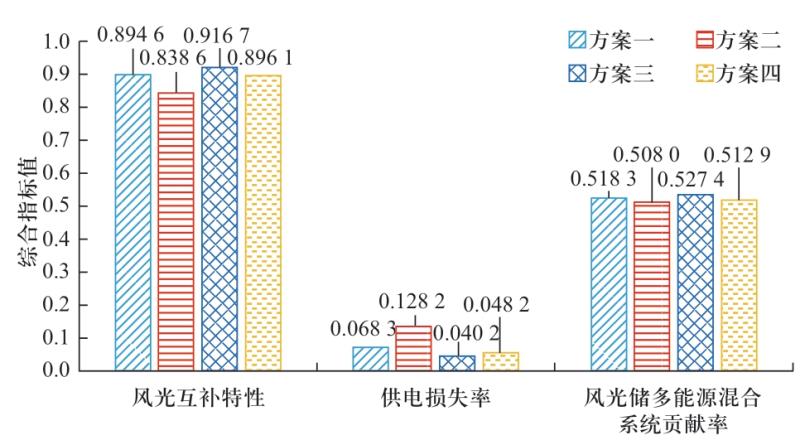由表2及圖4可知,由于不同規(guī)劃方案下的偏好不同,通過規(guī)劃得到的風(fēng)電場、光伏電站、重力儲能的容量均不同,從而導(dǎo)致了系統(tǒng)總成本和綜合指標(biāo)值的變化。對比4種規(guī)劃方案來看,方案二的系統(tǒng)總成本最小,方案三的綜合指標(biāo)最優(yōu)。另外,規(guī)劃方案一的初始成本為33 716.37萬元,規(guī)劃方案二的初始成本為33 582.87萬元,規(guī)劃方案三的初始成本為34 052.28萬元,規(guī)劃方案四的初始成本為33 017.28萬元,由于規(guī)劃方案三配置的風(fēng)電場容量、儲能容量最大,而風(fēng)電場的安裝成本又比較高,所以導(dǎo)致規(guī)劃方案三的初始成本較高。此外,規(guī)劃方案三配置了相比其他幾種方案較大容量的儲能,主要是為了保證系統(tǒng)的供電可靠性及系統(tǒng)的貢獻(xiàn)率,而規(guī)劃方案二為追求系統(tǒng)總成本最小,配置的儲能容量最小,同時配置的風(fēng)電場容量也最小。