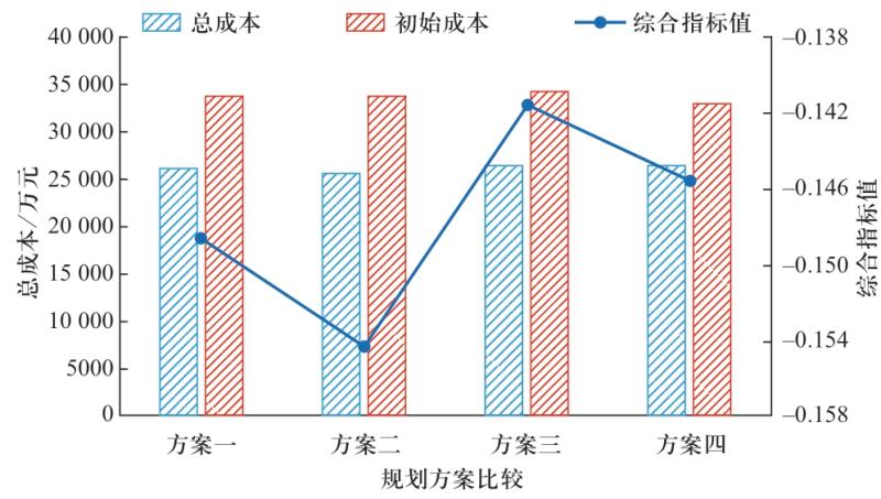 Fig.4 Total cost and comprehensive index values of four planning schemes
