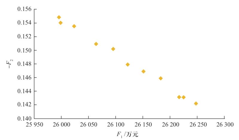 本文借助MATLAB軟件,利用多目標(biāo)自適應(yīng)混沌粒子群算法求解建立的多目標(biāo)容量優(yōu)化規(guī)劃模型,得到多目標(biāo)帕累托前沿,如圖3所示。其中,橫坐標(biāo)F1表示系統(tǒng)總成本,縱坐標(biāo)-F2表示綜合指標(biāo)的相反數(shù),帕累托前沿中的每個點(diǎn)都表示一個規(guī)劃方案,共有11個可行的規(guī)劃方案。由圖3可知,系統(tǒng)總成本及綜合指標(biāo)均在比較小的范圍內(nèi)變化,滿足系統(tǒng)總成本越小,綜合指標(biāo)的相反數(shù)越大,即系統(tǒng)總成本的降低,對綜合指標(biāo)有著負(fù)面的影響。類似的,如果綜合指標(biāo)更優(yōu),系統(tǒng)總成本將會增大,兩個目標(biāo)之間存在一定的制約關(guān)系。