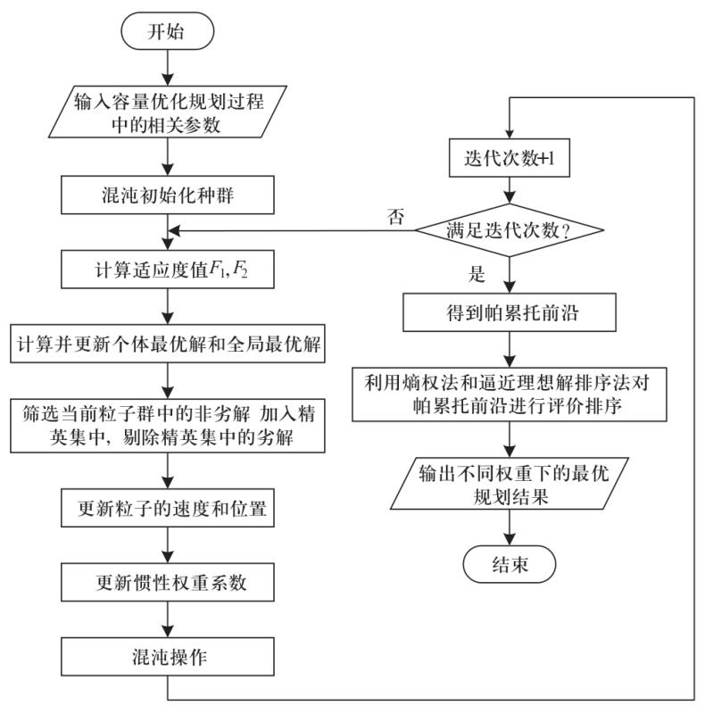 對所建立的多目標(biāo)容量優(yōu)化規(guī)劃模型利用自適應(yīng)混沌粒子群算法[21]進(jìn)行仿真求解,得到一系列非劣解,并由一系列非劣解組成帕累托前沿。在帕累托前沿中,利用熵權(quán)法[22]求解不同目標(biāo)函數(shù)的權(quán)重,并利用逼近理想解排序法[23]對求得的帕累托前沿進(jìn)行排序評價,選擇排序評價最優(yōu)的解作為最優(yōu)規(guī)劃方案,具體計算流程如圖2所示。基于求解得到的風(fēng)光儲多能源混合系統(tǒng)多目標(biāo)容量優(yōu)化規(guī)劃結(jié)果,利用熵權(quán)法定權(quán)的秩和比評價方法[24]對不同規(guī)劃方案下的可靠性指標(biāo)進(jìn)行排序評價,具體評價流程如附錄B圖B1所示。