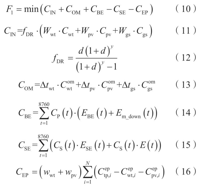 1)目標(biāo)函數(shù)1:系統(tǒng)總成本(F1)最小,包括系統(tǒng)初始成本、運(yùn)行維護(hù)成本、購電成本、售電收益及環(huán)保收益等。