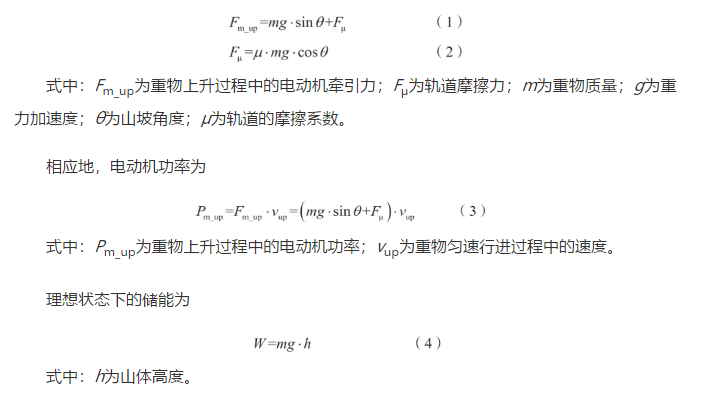 本文假設(shè)在建模過程中只有一條軌道,即只研究一套重力儲能裝置,只考慮山體高度、坡度、重物質(zhì)量等對重力儲能存儲和釋放能量多少的影響。其中,在存儲能量時,電動機(jī)工作,消耗電能,利用滑輪組將重物從山底軌道處拉至山頂,過程中重力勢能增加,最終在山頂存儲起來。電動機(jī)將重物從山底拉上山頂過程中保持勻速,此時重物受力包括摩擦力、電動機(jī)牽引力、自身重力等,具體的重物受力平衡可用式(1)—(2)表示。