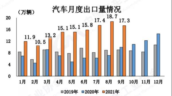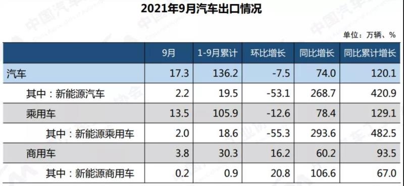 9月,汽車企業(yè)出口17.3萬輛,環(huán)比下降7.5%,同比增長(zhǎng)74.0%。1-9月,汽車企業(yè)出口136.2萬輛,同比增長(zhǎng)1.2倍。中汽協(xié)副總工程師許海東特別介紹,新能源汽車在出口市場(chǎng)中扮演著越來越重要的作用,數(shù)據(jù)顯示,1-9月,新能源汽車出口達(dá)到了19.5萬輛,占比達(dá)到14.32%。未來,新能源汽車出口可能會(huì)在我國(guó)汽車出口中扮演更重要的角色。