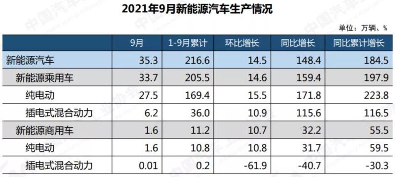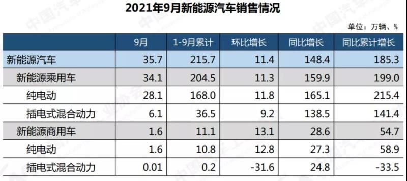 9月,新能源汽車產(chǎn)銷分別完成35.3萬輛和35.7萬輛,同比均增長(zhǎng)1.5倍。本月新能源產(chǎn)銷繼續(xù)刷新記錄。純電動(dòng)汽車、插電式混合動(dòng)力汽車的產(chǎn)銷也均刷新記錄。9月新能源汽車市場(chǎng)滲透率繼續(xù)維持歷史高位,為17.3%,新能源乘用車市場(chǎng)滲透率達(dá)到19.5%。1-9月,新能源汽車產(chǎn)銷分別完成216.6萬輛和215.7萬輛,同比分別增長(zhǎng)1.8倍和1.9倍。