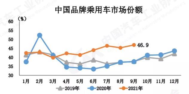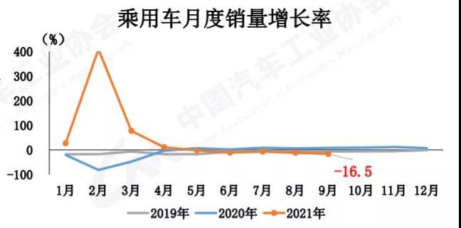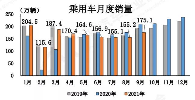 9月,乘用車產(chǎn)銷分別完成176.7萬輛和175.1萬輛,環(huán)比分別增長(zhǎng)18.1%和12.8%,同比分別下降13.9%和16.5%,降幅比8月分別擴(kuò)大2和4.8個(gè)百分點(diǎn)。與2019年相比,乘用車產(chǎn)銷同比下降5.4%和9.5%,產(chǎn)量降幅比8月縮小6.3個(gè)百分點(diǎn),銷量降幅比8月擴(kuò)大3.3個(gè)百分點(diǎn)。9月汽車產(chǎn)業(yè)受芯片短缺影響依然較為明顯,一定程度影響了企業(yè)產(chǎn)銷量。