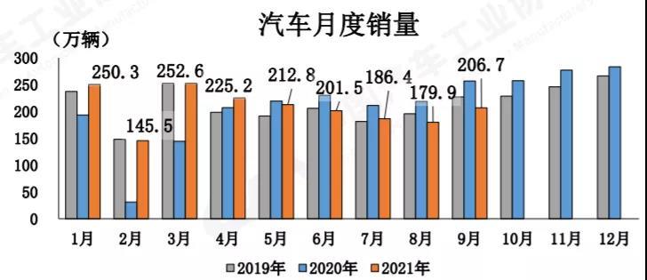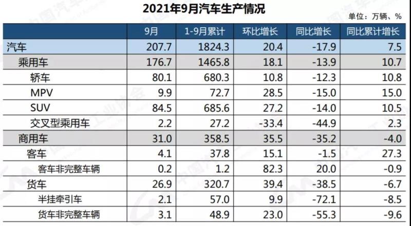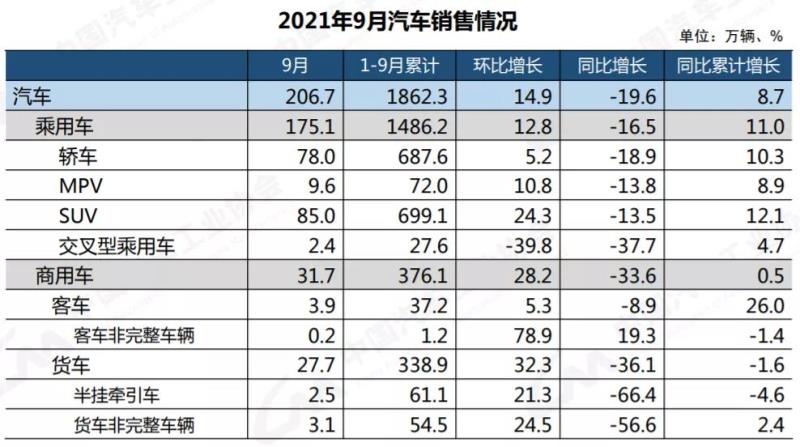 1-9月,汽車產(chǎn)銷分別完成1824.3萬輛和1862.3萬輛,同比分別增長(zhǎng)7.5%和8.7%,增幅比1-8月繼續(xù)回落4.4和5個(gè)百分點(diǎn)。與2019年同期相比,產(chǎn)銷同比分別增長(zhǎng)0.4%和1.3%,增幅比1-8月分別回落0.9和1.4個(gè)百分點(diǎn)。
