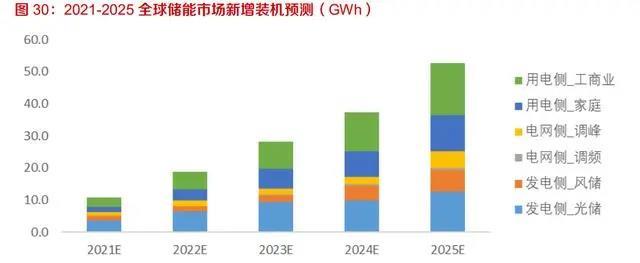 表前市場增長來自新能源+儲能和獨(dú)立儲能電站參與電力輔助服務(wù)。在新能源發(fā)電配置儲能的市場, 考慮到光伏發(fā)電的波動性為日內(nèi)波動,風(fēng)電波動多為季節(jié)性波動,光伏配置短時(shí)儲能的適配度更高, 對光伏+儲能和風(fēng)電+儲能按照不同的配置比例預(yù)測。我們按照光伏配儲能當(dāng)期配比 8%儲能時(shí)長 2 小時(shí),遠(yuǎn)期配比 20%儲能時(shí)長 3.5 小時(shí)來估算,風(fēng)電配儲能按照配比 3%儲能市場 2 小時(shí),遠(yuǎn)期配 比 15%儲能市場 3.5 小時(shí)估算。我們預(yù)測,美國 2025 年新能源發(fā)電配套儲能電站新增裝機(jī)容量為 19.3GWh,其中光伏配套 12.61GWh,風(fēng)電配套 6.7GWh。