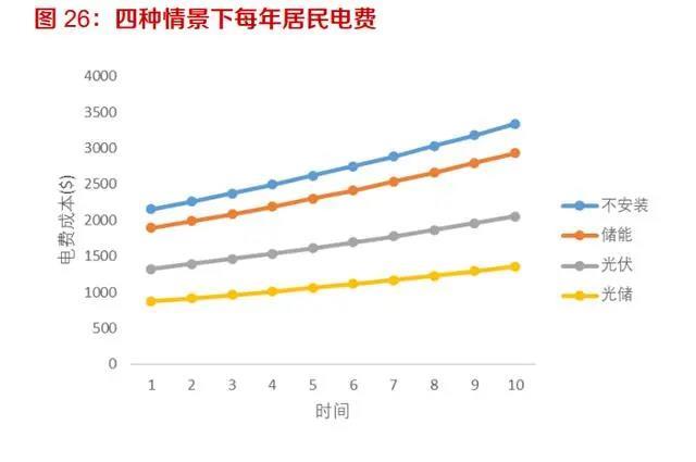 根據(jù)計(jì)算結(jié)果,十年里,四種情景下光儲系統(tǒng)的每年電費(fèi)比不安裝光伏和儲能系統(tǒng)低 59%;安裝 光伏比不安裝低 38%;由于美國居民用電量高,且峰谷價(jià)差大,安裝儲能的年用電費(fèi)也比不安裝 低 12%。綜合設(shè)備成本、設(shè)備維護(hù)費(fèi)用及電費(fèi)來看,相比于不安裝的情景,在全壽命周期內(nèi),安裝 光儲及單獨(dú)安裝光伏都具備一定的經(jīng)濟(jì)性,單獨(dú)安裝光伏的累計(jì)成本為$23918.93,安裝光儲系統(tǒng) 的累計(jì)成本為$22422.01。使用時(shí)間超過 8 年,安裝光儲系統(tǒng)相比于其他方案跟節(jié)約成本。