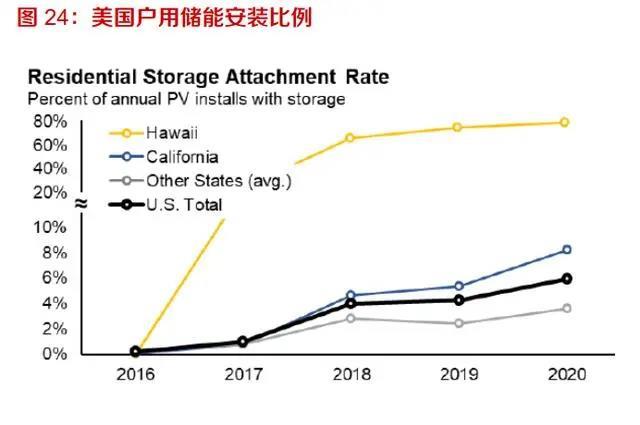 家庭安裝光儲系統(tǒng)可以獲得明顯的經(jīng)濟(jì)收益。根據(jù)伯克利實(shí)驗(yàn)室的統(tǒng)計(jì),截至 2020 年表后側(cè)安裝 儲能容量約為 1000MW,其中 550MW 與太陽能光伏配對。目前絕大多數(shù)戶用儲能與光伏配對 (80%),非住宅儲能只有 40%與光伏共建。美國戶用光儲共建比例最高的是夏威夷州,其次是 加州。電化學(xué)儲能系統(tǒng)的成本逐年下降,目前光儲系統(tǒng)的成本在$5/W,聯(lián)邦范圍內(nèi)安裝光儲系統(tǒng) 可以獲得 ITC 稅收減免 30%,亞利桑那州、加州等提供額外的光儲系統(tǒng)退稅,用戶可以通過峰谷 套利、自發(fā)自用等方式節(jié)省用電費(fèi)用。光儲系統(tǒng)使用 5-10 年之后可以回收部分成本。綜合計(jì)算后 系統(tǒng)可以獲得$500-1000/kWh 的經(jīng)濟(jì)收益。
