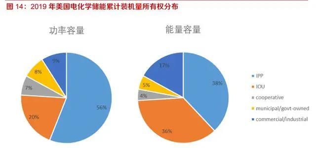 美國儲能應(yīng)用場景包括表前(Front of the Meter,F(xiàn)TM)和表后(Behind the Meter,BTM), 對應(yīng)于國內(nèi)應(yīng)用場景的劃分,表前通常指電網(wǎng)側(cè)和發(fā)電側(cè),表后指用戶側(cè),包括家庭和工商業(yè)。目 前美國表前側(cè)儲能市場分屬于不同的區(qū)域電力市場,目前較大的為PJM市場、CAISO市場、ERCOT 市場等,儲能的市場供給參與方包括 IPP(獨(dú)立發(fā)電商)、IOU(投資者擁有的公用事業(yè)端)等。根據(jù) EIA 統(tǒng)計(jì),截至 2019 年,IPP 擁有美國大型電化學(xué)儲能現(xiàn)有功率容量的 56%,IOU 擁有 20%, 而針對能量市場,IPP 擁有 38%,IOU 擁有 36%。