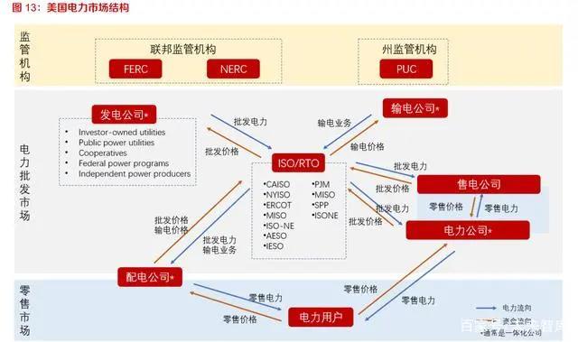 美國電力體系的市場化成熟,形成了由聯(lián)邦層面的 FERC(美國聯(lián)邦能源監(jiān)管委員會)和 NERC (北美可靠電力公司)以及州層面的 PUC(公用事業(yè)委員會)監(jiān)管的市場體系。美國的電力系統(tǒng)被劃分為東部網(wǎng)(Eastern Interconnection)、西部網(wǎng)(Western Interconnection)和德 州網(wǎng)(Electric Reliability Council of Texas, ERCOT)三大區(qū)域電網(wǎng)。在電網(wǎng)內(nèi)劃分為多個(gè)區(qū) 域市場。市場主體是 RTO(區(qū)域傳輸組織)或 ISO(獨(dú)立系統(tǒng)運(yùn)營方)。