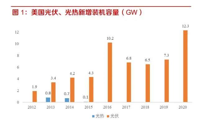 美國可再生能源裝機(jī)容量大幅提升。為達(dá)成碳中和目標(biāo),美國加速推進(jìn)電氣化計(jì)劃,推動可再生能 源成為發(fā)電主力。根據(jù) EIA 統(tǒng)計(jì),2020 年,美國新增光伏裝機(jī) 12.3GW,在疫情影響下仍達(dá)到了 歷史最大容量增幅;新增風(fēng)電裝機(jī) 17.1GW,可再生能源(包括風(fēng)能、水電、太陽能、生物質(zhì)能和 地?zé)崮埽┊a(chǎn)生了創(chuàng)紀(jì)錄的 8340 億 kWh 的電力,約占美國總發(fā)電量的 21%??稍偕茉从惺芬?來首次超過核能(7900 億 kWh)和煤炭(7740 億 kWh)。