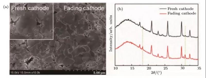 所謂電池有損檢測(cè)是指通過電池拆解、極片觀察及材料測(cè)試分析來確定正負(fù)極片、活性材料以及隔膜等因素在電池失效中的作用。其中材料的測(cè)試分析則以物化性能和電化學(xué)性能測(cè)試為主。例如對(duì)上述LiFePO4/C失效電池極片進(jìn)行掃描電子顯微鏡(SEM)形貌測(cè)試結(jié)果顯示正極材料有明顯的結(jié)構(gòu)破壞,X射線衍射(XRD)結(jié)構(gòu)譜圖中18.5?和31?峰強(qiáng)的增加揭示了Fex(POy)相的增加,即正極材料存在相變現(xiàn)象(如圖8所示)。對(duì)極片表面進(jìn)行X射線光電子能譜(XPS)分析,以及對(duì)極片進(jìn)行半電池測(cè)試則能夠定性和定量分析極片表面SEI和容量損失。最后總結(jié)得出定性或定量的失效原因,并提供分析報(bào)告。鋰電池失效機(jī)理研究是通過大量基礎(chǔ)科研,以及構(gòu)建合理模型和驗(yàn)證實(shí)驗(yàn), 準(zhǔn)確模擬分析電池內(nèi)部復(fù)雜的物理化學(xué)反應(yīng)過程, 找出電池失效的本質(zhì)原因,構(gòu)建失效原因數(shù)據(jù)庫。電池機(jī)理分析可能會(huì)從不同角度去開展,包括設(shè)計(jì)材料角度和設(shè)計(jì)失效角度。