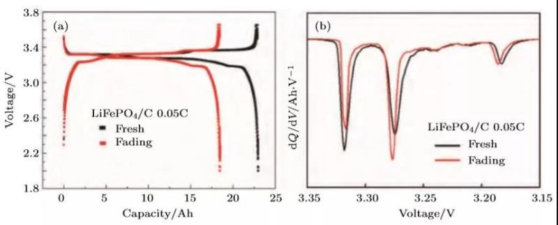 圖7 某款LiFePO4/C失效電池和新鮮電池全電池(a)充放電曲線及(b)對(duì)應(yīng)放電曲線的IC曲線