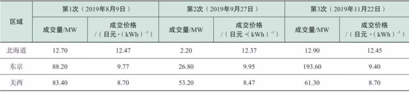 如表1所示,2020年日本交割的基荷電力分別于2019年8月、9月和11月進行了競價交易,分為北海道、東京和關(guān)西3個區(qū)域市場進行。從交易價格來看,基荷電力市場價格并不低于現(xiàn)貨市場平均價格(2019年現(xiàn)貨市場均價7.93日元/kWh),基荷市場并未突顯價格優(yōu)勢。從交易量來看,3個市場成交量為534.3 MW,相當于每年4.68 TWh,僅占新電力公司2019年度全部售電量(129.1 TWh)的3.6%。