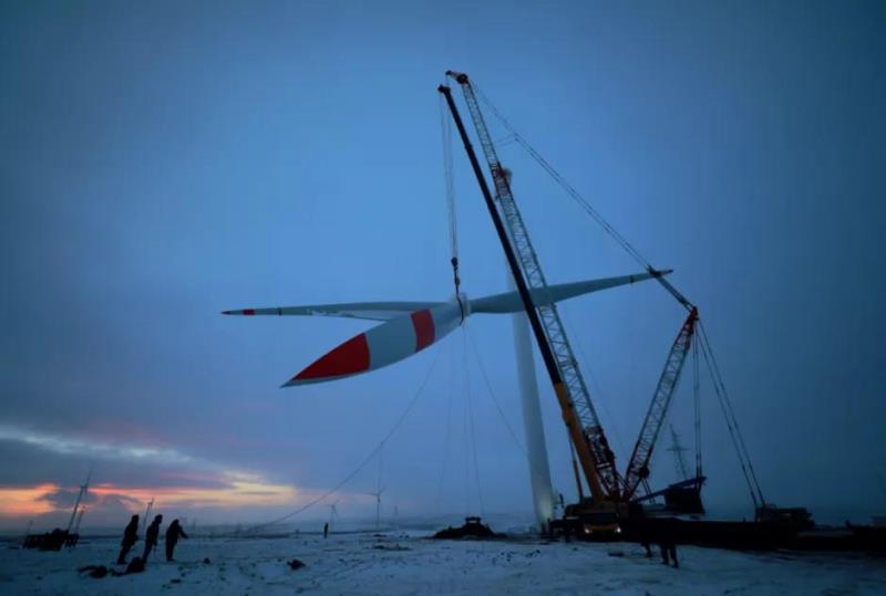 2020年11月27日,國網(wǎng)冀北電力施工人員在 國家風(fēng)光儲輸示范工程(二期)4.5兆瓦風(fēng)機(jī) 吊裝現(xiàn)場開展施工作業(yè)。攝影 / 李崢