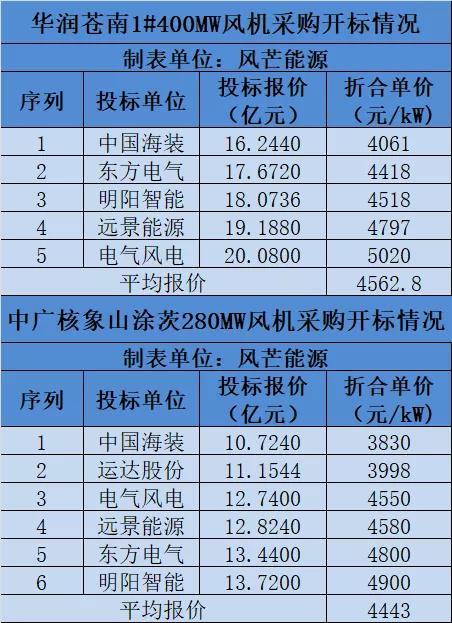 中廣核象山涂茨280MW海上風(fēng)電項(xiàng)目風(fēng)機(jī)采購共有6家整機(jī)商競標(biāo),平均投標(biāo)報(bào)價(jià)4443元/kW。