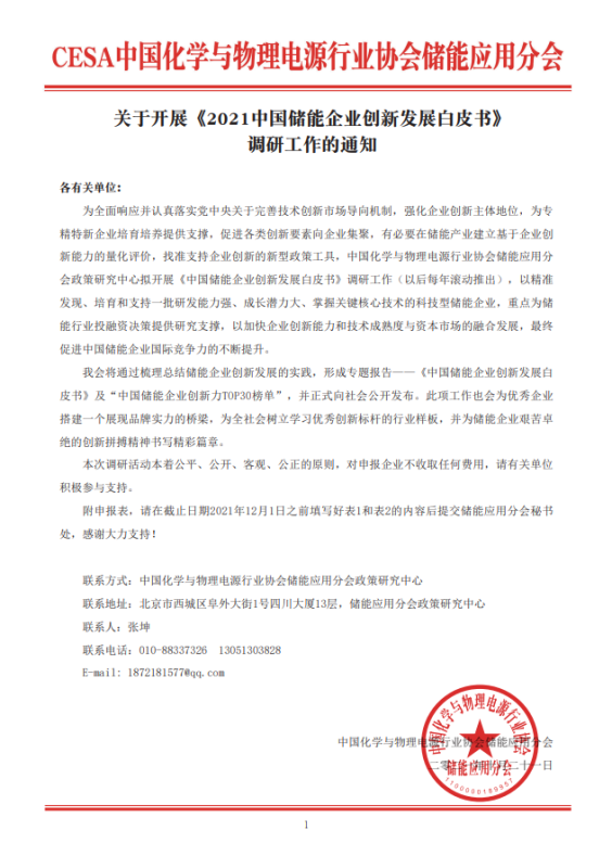 關(guān)于開展《2021中國儲能企業(yè)創(chuàng)新發(fā)展白皮書》調(diào)研工作的通知
